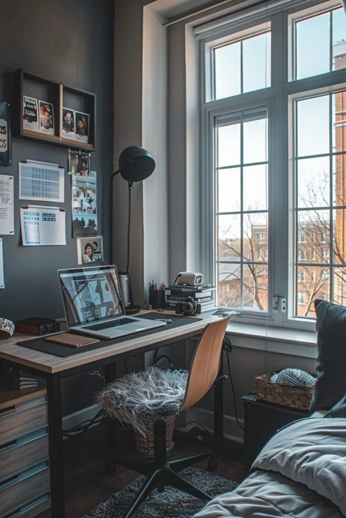 Opt for a wood desk with rich tones and a leather chair for a timeless, refined look. Add a soft rug underfoot, a classic table lamp, and framed art for a sophisticated finish. The window’s natural light highlights the materials beautifully, giving your workspace a high-end, library-like atmosphere. This design is perfect for those who want their dorm to feel mature and inspiring.