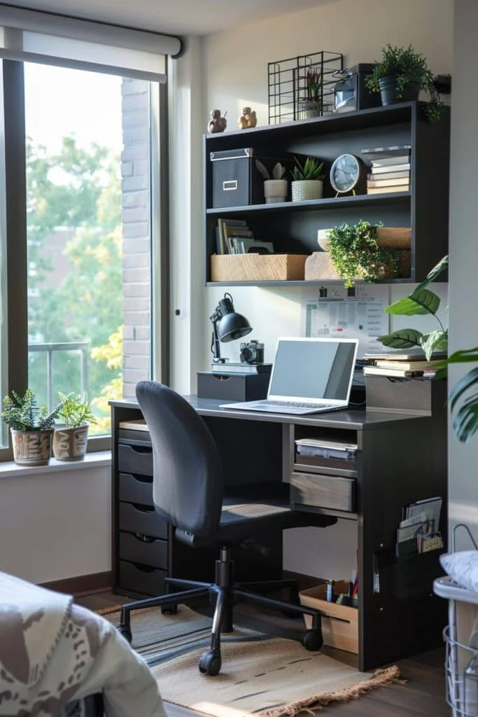 A functional dorm desk by the window makes the most of your view while keeping productivity in check. The key here is balance — a setup that combines comfort, organization, and functionality.